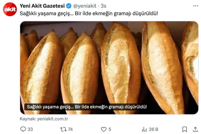 Daha önce 260 gram olarak satılan ekmeğin, yeni düzenlemeyle 220 gram olarak satışa sunulurken, Yeni Akit ekmeğe zam haberini "Sağlıklı yaşama geçiş" ifadelerini kullandı.