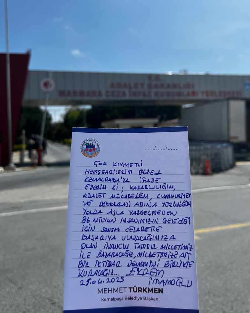Ekrem İmamoğlu, ziyaretin sonunda Kemalpaşalılara özel bir not iletti. El yazısıyla kaleme aldığı notta şu ifadelere yer verdi: “Çok kıymetli hemşehrilerim, güzel Kemalpaşa’ya ifade ederim ki; kararlılığım, adalet mücadelem, Cumhuriyet ve demokrasi adına yürüdüğüm yolda asla vazgeçmeden, 86 milyon insanımızın geleceği için sonsuz cesaretle başarıya ulaşacağımıza olan inancım tamdır. Milletimizle başaracağız, milletimize ait bir iktidar dönemini birlikte kuracağız.”
