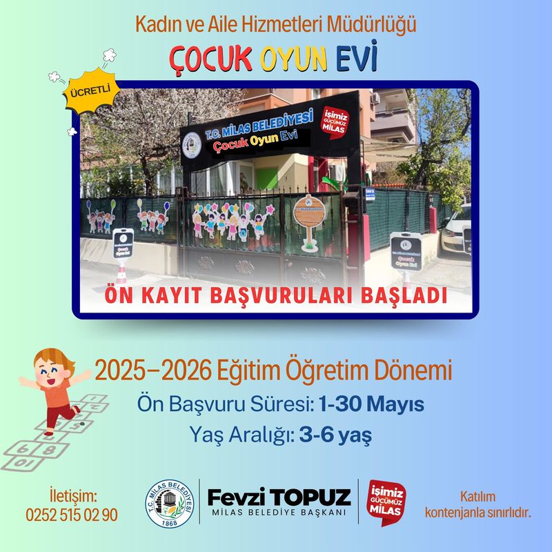 Milas Belediyesi Kadın ve Aile Hizmetleri Müdürlüğü’nden yapılan bilgilendirmede Çocuk Oyun Evi’ne 3-6 yaş grubu çocukların kabul edileceği, gelir düzeyi düşük ailelerin öncelikli olacağı ve ön kayıt şartlarını geçen ailelerin kesin kayıt için çağrılacağı bildirildi.