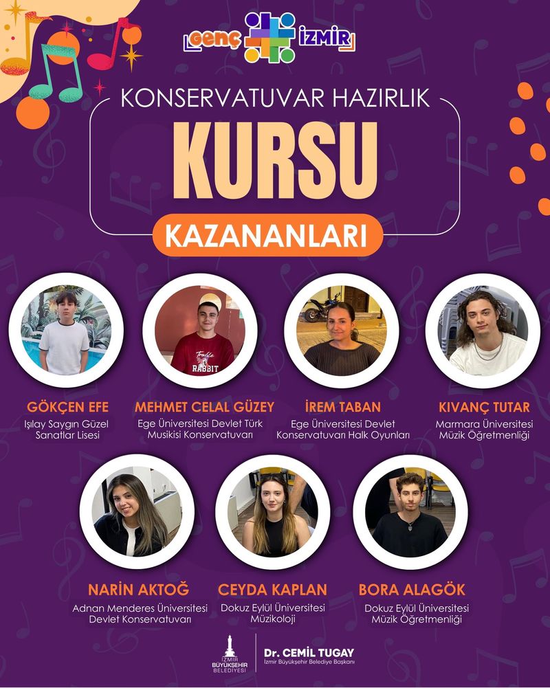 İzmir Büyükşehir Belediyesi’nin, gençlerin gelişimini desteklemek ve sanat eğitiminde fırsat eşitliği sağlamak amacıyla başlattığı Genç İzmir Konservatuvar Hazırlık Kursu, bir kez daha umutların yeşermesini sağladı. Genç İzmir Alsancak'ta ve Bornova Macera Park'ta eğitmenler Mustafa Bayık ve Ozan Kara’nın rehberliğinde yürütülen kurslarda öğrenciler yoğun bir hazırlık sürecinden geçerek özel yetenek sınavlarına hazırlandı. Sanat eğitmenlerinin ortak çabasıyla ortaya çıkan güçlü eğitim programı sayesinde yedi öğrenci farklı üniversitelerin konservatuvar ve müzik bölümlerine yerleşti.
