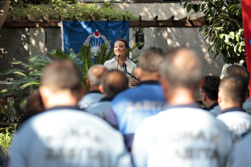 Zabıta teşkilatının belediyecilik hizmetlerinin en önemli unsurlarından biri olduğunu belirten Konak Belediye Başkanı Nilüfer Çınarlı Mutlu, “Sizinle birlikte çalışmaktan gurur duyuyorum. Hepiniz Konak sınırlarında belediyemizi çok güzel temsil ediyorsunuz. Esnaftan ve vatandaşlardan sizlerin kibarlığı, güler yüzü ve çözümcü yaklaşımınız ile ilgili hep güzel şeyler duymak beni çok mutlu ediyor. Bunun için sizlere çok teşekkür ediyorum. Zor bir görev yapıyorsunuz, hiç kolay değil. Ben kuralcı bir başkanım; istiyorum ki sokaklar nizami olsun, kurallara uyulsun. Bunu ancak sizin desteğinizle başarabiliriz. Emekleriniz için çok teşekkür ediyorum. 199 yıllık bir teşkilat, çok köklü bir geçmiş ve bunu bu kadar iyi temsil eden çalışma arkadaşlarım olduğu için ne mutlu bana” dedi.