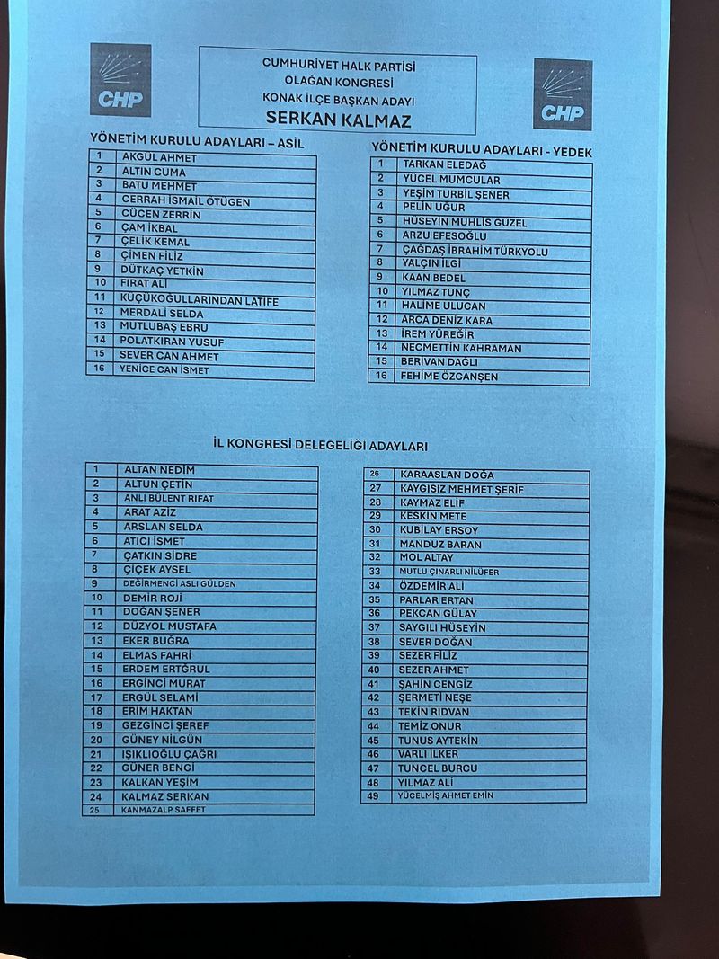 CHP Konak'ta iki adayın yarıştığı seçimi Serkan Kalmaz kazandı. Serkan Kalmaz CHP Konak'ta yeni ilçe başkanı oldu. Serkan Kalmaz seçimde 209 oy aldı. Orçun Altanhan 154 oyda kaldı.