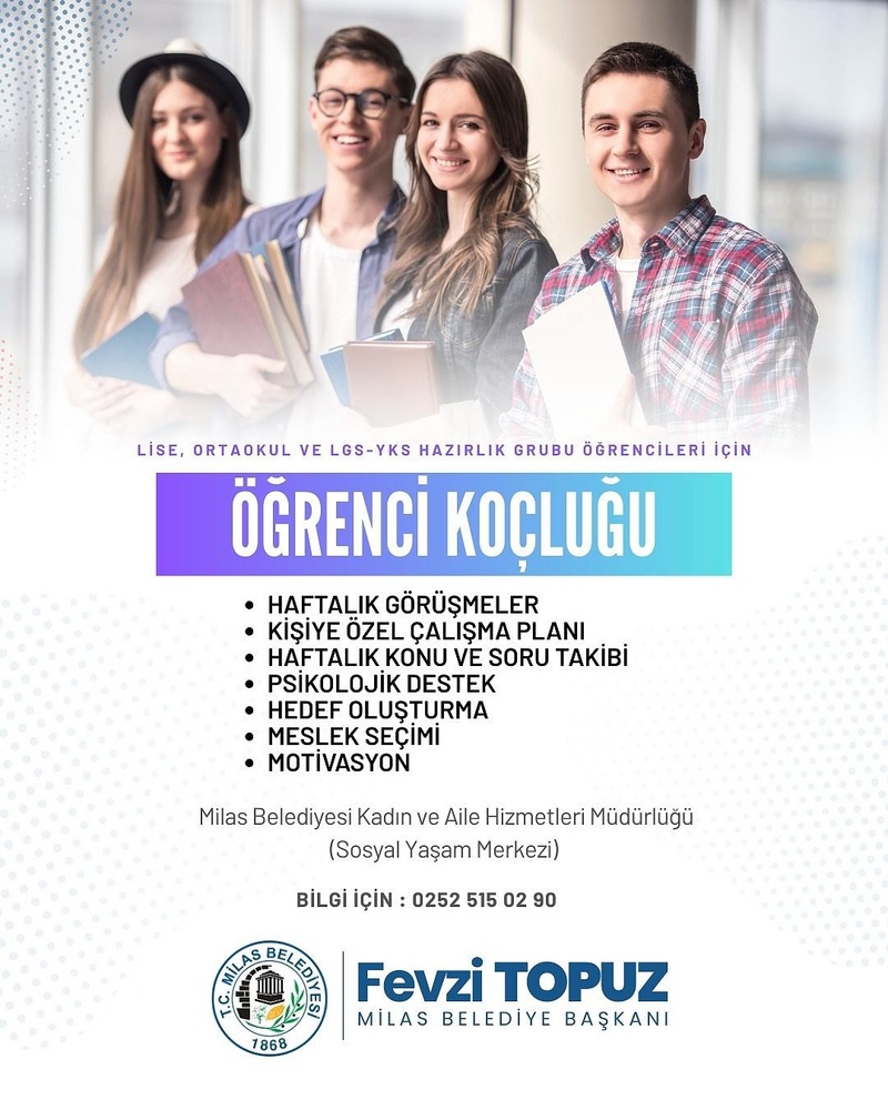 Milas Belediyesi Kadın ve Aile Hizmetleri Müdürlüğü bünyesinde bulunan alanında deneyimli personeller tarafından lise, ortaokul LGS (Liselere Giriş Sınavı) ve YKS (Yükseköğretim Kurumları Sınavı) hazırlanan öğrencilere yönelik; haftalık görüşmeler, kişiye özel çalışma planı, haftalık konu ve soru takibi, psikolojik destek, hedef oluşturma, meslek seçimi ve motivasyon sağlama çalışmalarının yapılacağı ‘Öğrenci Koçluğu’ hizmeti ücretsiz olarak öğrencilerle buluşacak.