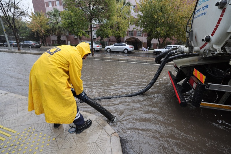 Yoğun yağışın etkili olduğu bölgelerde ekipler, mazgal temizliği, pompa sistemleri ve yağmur suyu hatları üzerinden hızlı tahliye çalışmaları gerçekleştirdi. Bornova, Buca, Menderes ve Konak başta olmak üzere riskli noktalara anında müdahale edilirken, taşkın tehlikesi büyümeden kontrol altına alındı.