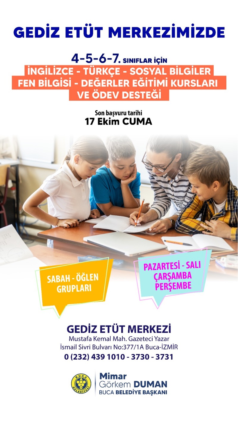 Sosyal belediyecilik anlayışıyla çalışmalar gerçekleştiren Buca Belediyesi, özellikle dezavantajlı bölgelerdeki çocukların eşit eğitim imkânlarından faydalanmasını hedefliyor. Belediye, bu nedenle Gediz Etüt Merkezi'nde 4, 5, 6 ve 7. sınıf öğrencileri için ücretsiz 'derslere destek kursları' başlatıyor. Kurslar kapsamında İngilizce, sosyal bilgiler, Türkçe, fen bilgisi ve değerler eğitimi derslerinin yanı sıra öğrencilere ödev desteği de verilecek. Dersler, sabah ve öğlen grupları olmak üzere pazartesi, salı, çarşamba ve perşembe günleri Buca Belediyesi'nin Mustafa Kemal Mahallesi'nde bulunan ek hizmet binasında gerçekleştirilecek.