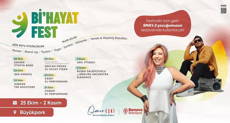 Bornova Belediyesi’nin düzenlediği “Bi’Hayat Fest”, 25 Ekim – 2 Kasım 2025 tarihleri arasında Büyükpark’ta gerçekleşecek. Konserler, tiyatro, yoga, zumba, atölyeler ve lezzetli stantlarla dolu festivalin tüm geliri, SMA hastası iki çocuğun tedavisine destek olmak için kullanılacak.