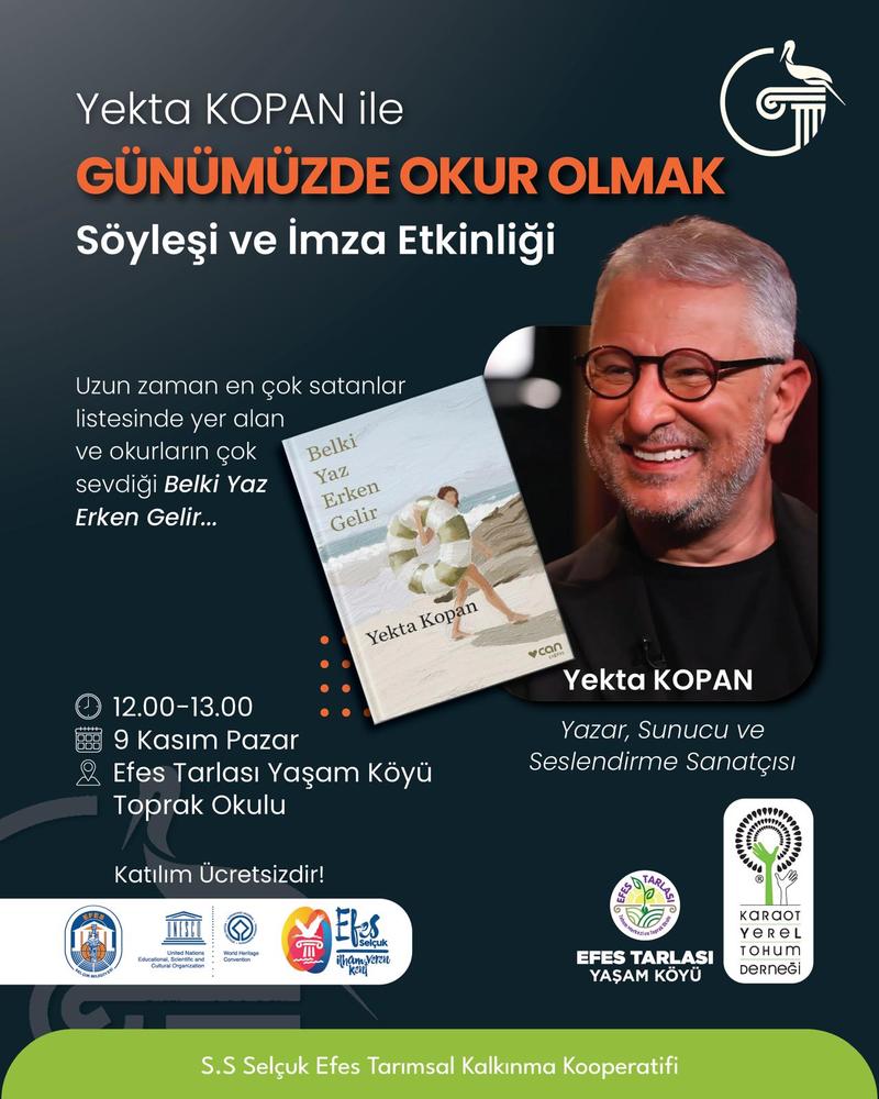 Efes Selçuk Belediyesi, her pazar Efes Tarlası Yaşam Köyü’nde düzenlendiği Üretici Pazarı etkinlikleri kapsamında bu hafta Yazar, sunucu ve seslendirme sanatçısı Yekta Kopan, “Günümüzde Okur Olmak” başlıklı söyleşisiyle Efes Tarlası Yaşam Köyü’nde edebiyatseverlerle bir araya geliyor.