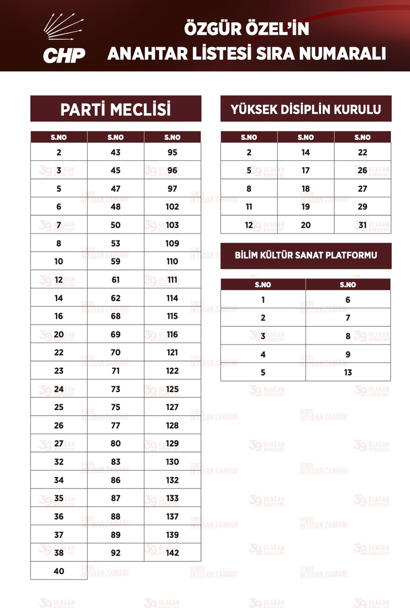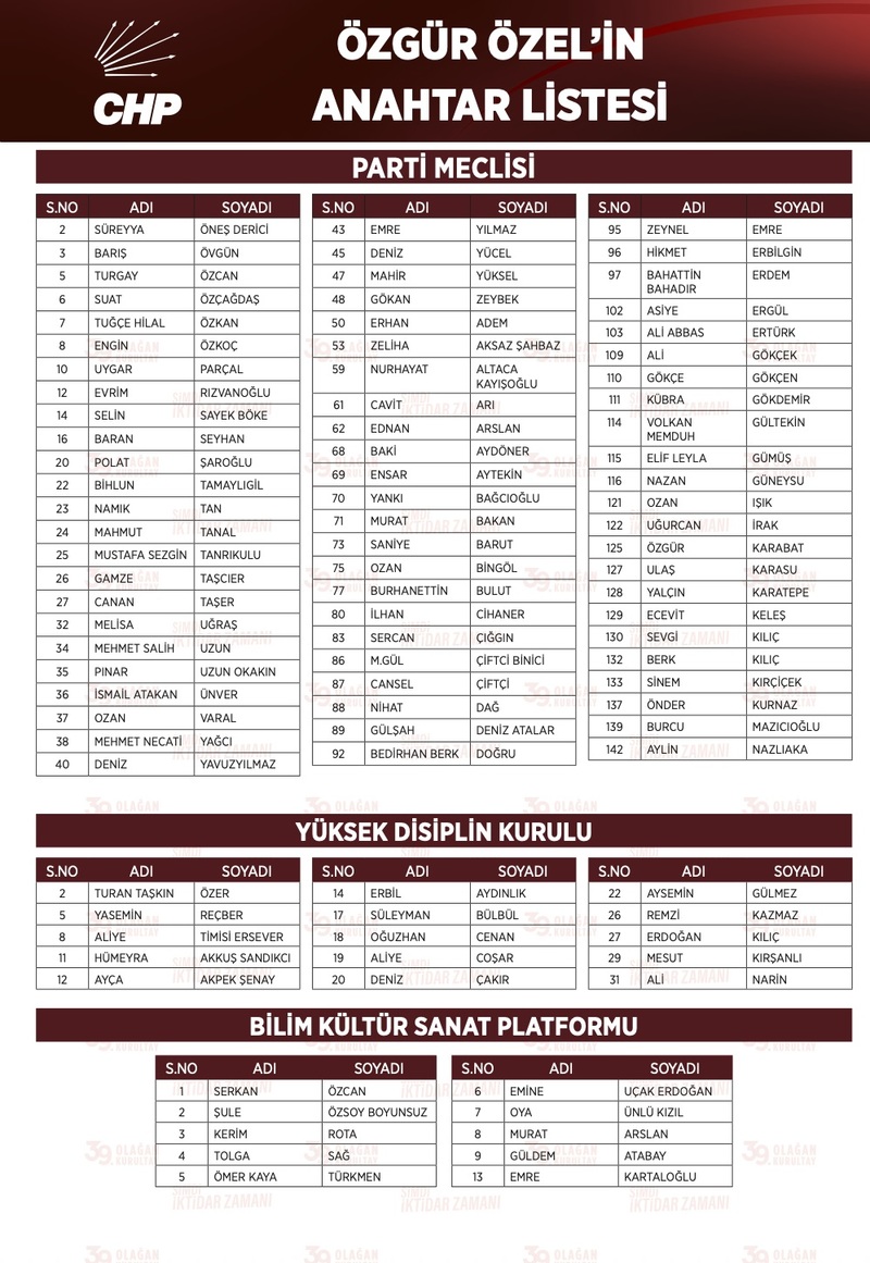 Özel’in anahtar listesinde PM adayları arasında Süreyya Öneş Derici, Barış Övgün, Turgay Özcan, Suat Özçağdaş, Tuğçe Hilal Özkan, Engin Özkoç, Uygar Parçal, Evrim Rızvanoğlu, Selin Sayek Böke, Baran Seyhan, Polat Şaroğlu, Bihlun Tamaylıgil, Namık Tan, Mahmut Tanal, Mustafa Sezgin Tanrıkulu, Gamze Taşcier, Canan Taşer, Melisa Uğraş, Mehmet Salih Uzun, Pınar Uzun Okakın, İsmail Atakan Ünver, Ozan Varal, Mehmet Necati Yağcı, Deniz Yavuzyılmaz, Emre Yılmaz, Deniz Yücel, Mahir Yüksel, Gökan Zeybek, Erhan Adem, Zeliha Aksaz Şahbaz, Nurhayat Altaca Kayışoğlu, Cavit Arı, Ednan Arslan, Baki Aydöner, Ensar Aytekin, Yankı Bağcıoğlu, Murat Bakan, Saniye Barut, Ozan Bingöl, Burhanettin Bulut, İlhan Cihaner, Sercan Çıggın, M. Gül Çiftci Binici, Cansel Çiftçi, Nihat Dağ, Gülşah Deniz Atalar, Bedirhan Berk Doğru, Zeynel Emre, Hikmet Erbilgin, Bahattin Bahadır Erdem, Asiye Ergül, Ali Abbas Ertürk, Ali Gökçek, Gökçe Gökçen, Kübra Gökdemir, Volkan Memduh Gültekin, Elif Leyla Gümüş, Nazan Güneysu, Ozan Işık, Uğurcan Irak, Özgür Karabat, Ulaş Karasu, Yalçın Karatepe, Ecevit Keleş, Sevgi Kılıç, Berk Kılıç, Sinem Kırçiçek, Önder Kurnaz, Burcu Mazıcıoğlu ve Aylin Nazlıaka yer aldı.