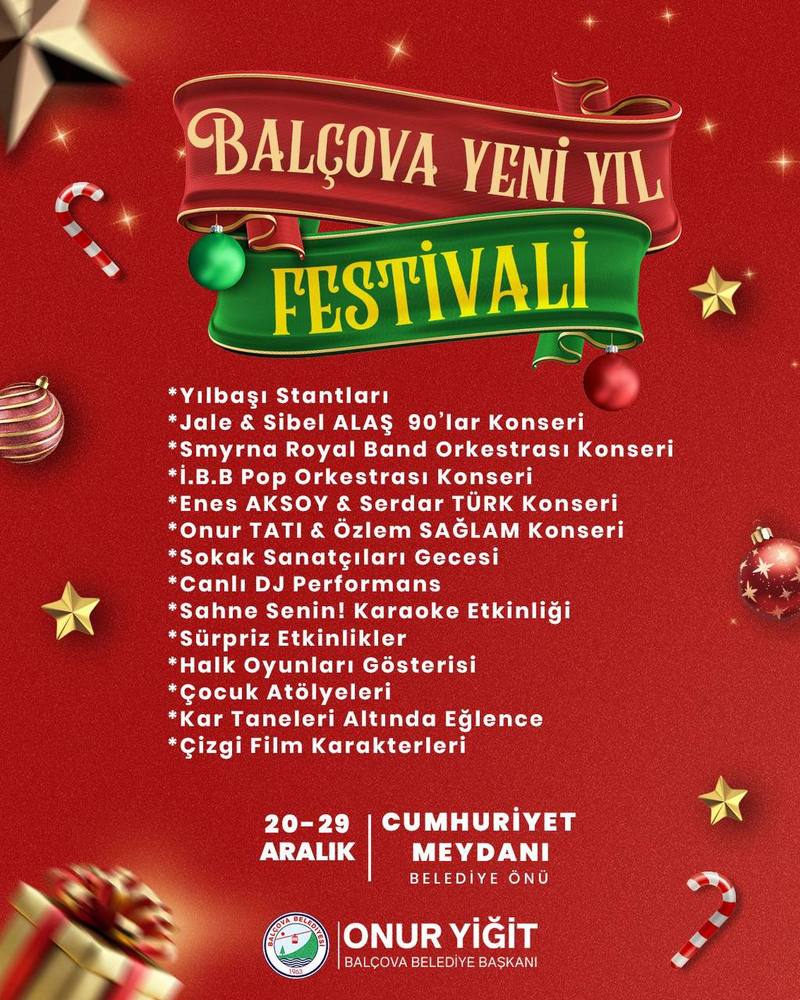 Balçova Belediyesi tarafından düzenlenen Balçova Yeni Yıl Festivali düzenliyor. Festival 20-29 Aralık tarihleri arasında Cumhuriyet Meydanı'nda konserler, sahne gösterileri ve çocuk etkinlikleriyle vatandaşları yeni yıl coşkusunda buluşturacak.