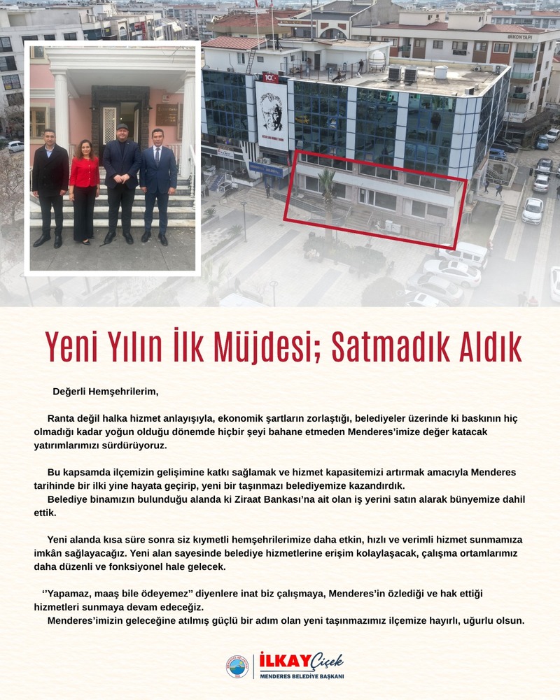 Konuyla ilgili açıklamada bulunan Menderes Belediye Başkanı İlkay Çiçek, ‘’ Ranta değil halka hizmet anlayışıyla, ekonomik şartların zorlaştığı, belediyeler üzerinde ki baskının hiç olmadığı kadar yoğun olduğu dönemde hiçbir şeyi bahane etmeden Menderes’imize değer katacak yatırımlarımızı sürdürüyoruz. Bu kapsamda ilçemizin gelişimine katkı sağlamak ve hizmet kapasitemizi artırmak amacıyla Menderes tarihinde bir ilki yine hayata geçirip, yeni bir taşınmazı belediyemize kazandırdık. Belediye binamızın bulunduğu alanda ki Ziraat Bankası’na ait olan iş yerini satın alarak bünyemize dahil ettik. Yeni alanda kısa süre sonra kıymetli hemşehrilerimize daha etkin, hızlı ve verimli hizmet sunmamıza imkân sağlayacağız. Yeni alan sayesinde belediye hizmetlerine erişim kolaylaşacak, çalışma ortamlarımız daha düzenli ve fonksiyonel hale gelecek. ’Yapamaz, maaş bile ödeyemez’ diyenlere inat biz çalışmaya, Menderes’in özlediği ve hak ettiği hizmetleri sunmaya devam edeceğiz. Menderes’imizin geleceğine atılmış güçlü bir adım olan yeni taşınmazımız ilçemize hayırlı, uğurlu olsun.’’ dedi.