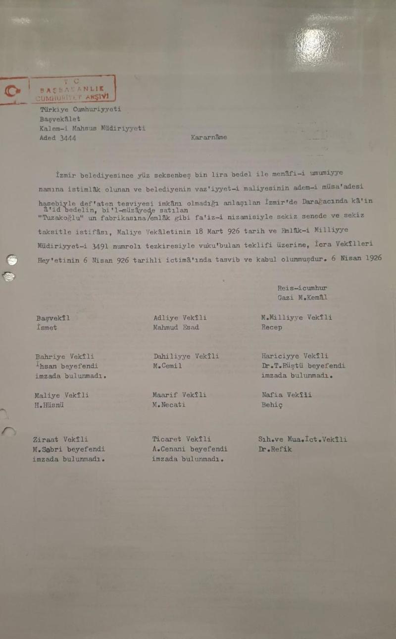 Bu belge, söz konusu taşınmazlardan birinin bizzat Gazi Mustafa Kemal Atatürk’ün imzasıyla başlayan satın alma süreci kanıtıdır. Bu yer 28/11/1940 tarihinde İzmir Belediyesi adına tescillenmiştir.