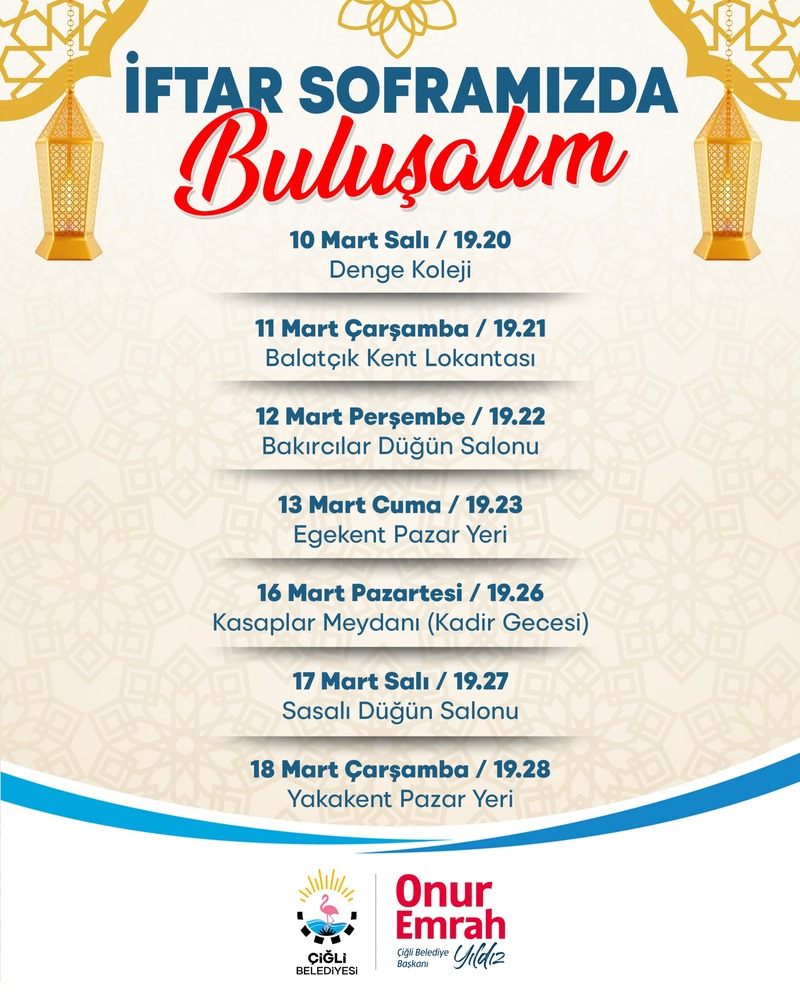 İftarlar, 23 Şubat Pazartesi günü Pelikan Sosyal Tesisi’nde başlayacak. Ardından 26 Şubat Perşembe günü Alyans (Ares) Düğün Salonu’nda devam edecek buluşmalar; 1 Mart Pazar günü Evka 2 Pazar Yeri’nde, 2 Mart Pazartesi günü Çiğli Merkez Kent Lokantası’nda ve 4 Mart Çarşamba günü Evka 5 İş Merkezi’nde gerçekleştirilecek. İftar sofraları 6 Mart Cuma günü Elit Düğün Salonu’nda, 9 Mart Pazartesi günü Atatürk Spor Salonu’nda, 10 Mart Salı günü Denge Koleji’nde, 11 Mart Çarşamba günü Balatçık Kent Lokantası’nda, 12 Mart Perşembe günü Bakırcılar Düğün Salonu’nda ve 13 Mart Cuma günü Egekent Pazar Yeri’nde kurulacak. Program, 16 Mart Pazartesi günü Kasaplar Meydanı’nda Kadir Gecesi özel iftar programıyla devam edecek; 17 Mart Salı günü Sasallı Düğün Salonu ve 18 Mart Çarşamba günü Yakakent Pazar Yeri’nde düzenlenecek iftarlarla tamamlanacak.