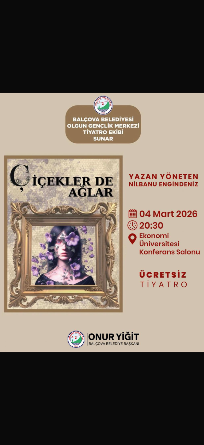 Çiçekler de Ağlar tiyatro oyunu, 4 Mart 2026 Çarşamba günü saat 20.30’da Ekonomi Üniversitesi Konferans Salonu’nda ücretsiz olarak sahnelenecek. Tüm yurttaşların davetli olduğu etkinlikte, izleyiciler hem güçlü bir hikâyeye tanıklık edecek hem de 8 Mart’ın anlamı üzerine birlikte düşünme fırsatı bulacak.