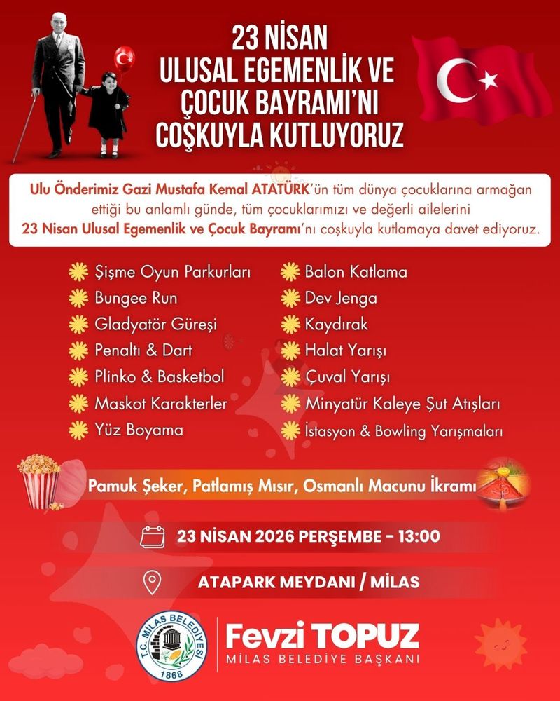 23 Nisan Ulusal Egemenlik ve Çocuk Bayramı’nda çocuklara özel birbirinden farklı etkinlikler düzenleyeceklerini belirten Milas Belediye Başkanı Fevzi Topuz, “Gazi Mustafa Kemal Atatürk tarafından çocuklarımıza ve tüm dünya çocuklarına armağan edilen bayramı belediyemiz tarafından düzenlenecek etkinliklerle coşkuyla kutlayacağız. Atapark Meydanı’nda kuracağımız oyun alanları ve düzenlenecek birbirinden farklı yarışma ve etkinliklerle çocuklarımız coşku dolu anlar yaşayacak. Türkiye Büyük Millet Meclisi'nin 106. kuruluş yılı ve 23 Nisan Ulusal Egemenlik ve Çocuk Bayramı’nı kutluyor, tüm çocuklarımızı belediyemiz tarafından düzenlenecek olan etkinliklere davet ediyorum” dedi.