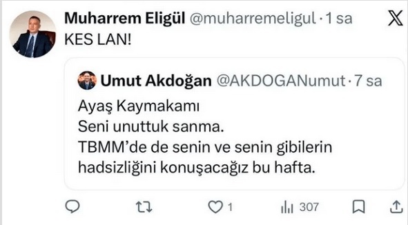 Ege'nin Sesi- Ankara Ayaş'ta 23 Nisan törenlerindeki protokol kriziyle başlayan gerginlik, Kaymakam Muharrem Eligül’ün CHP’li vekil Umut Akdoğan’a sosyal medyadan verdiği "Kes lan" yanıtı ile tekrar gündeme oturdu.
