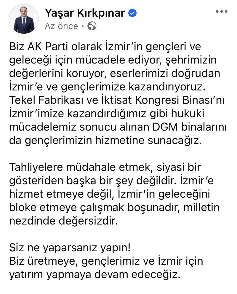 Büyükşehir Belediye Başkanı Cemil Tugay, İzmir'in malını korumak ve buraya haksız ve hukuksuz bir şekilde el konulmak istenmesi karşısında, var gücüyle haklı bir mücadele veriyor.