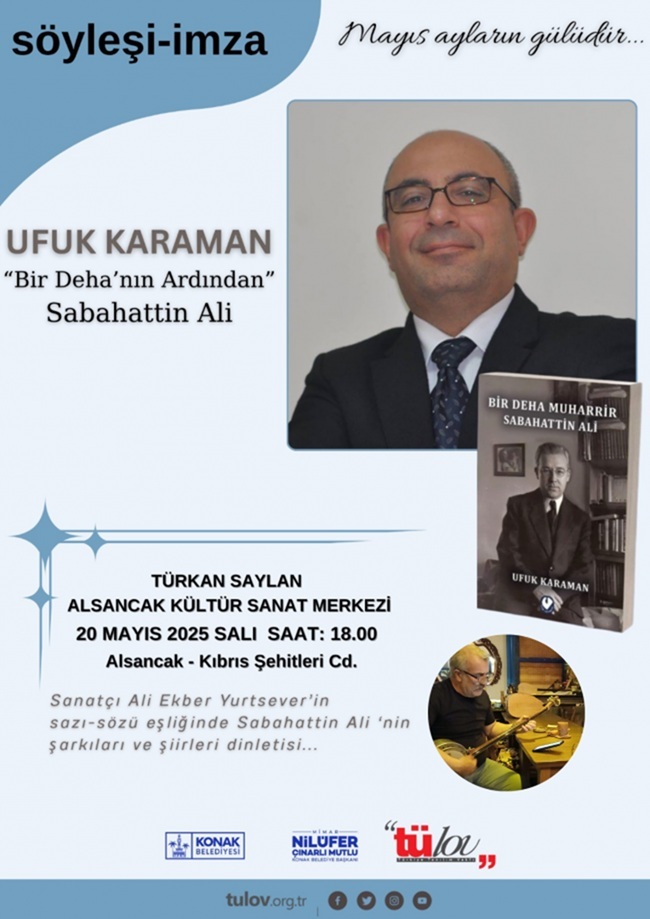 Türkiye Tanıtım Araştırma Demokrasi Ve Laik Oluşum Vakfı TÜLOV, Ufuk Karaman'ın “Bir Deha Muharrir” kitabını tanıtım, söyleşi ve imza etkinliğinde, 20 Mayıs 2025 Salı günü, saat 18.00'de İzmir Konak Belediyesi Türkan Saylan Alsancak Kültür Sanat Merkezi, Benal Nevzat Salonunda Sabahattin Ali'nin hayranlarıyla buluşacak.